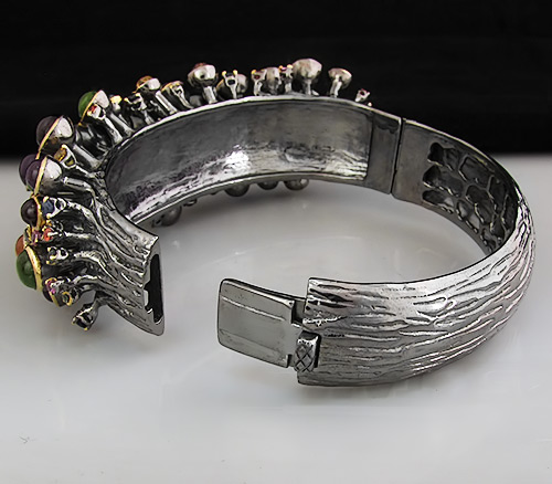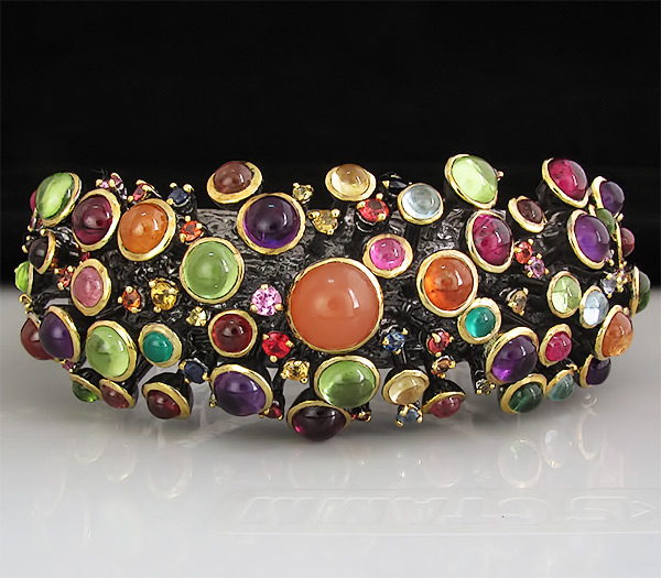 Браслет из текстурного черненого стерлингового серебра 925 пробы с кабошонами агата, аметиста, граната, корнелиана, перидота, топаза, турмалина. Вес браслета — 77.85 гр.  Площадка браслета — 82×30 мм. Выборочное золочение.