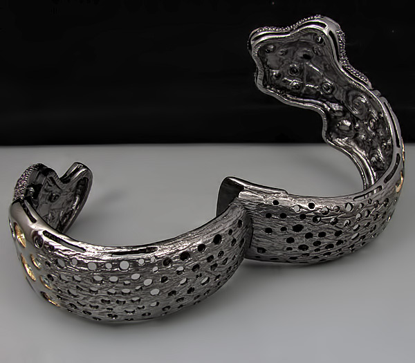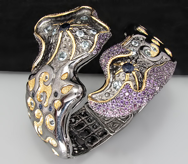Браслет из черненого стерлингового серебра 925 пробы с аметистами, топазами и сапфирами. Вес браслета — 91,7 гр. Площадка браслета — 74×62 мм. Выборочное золочение.