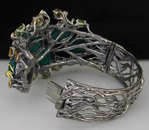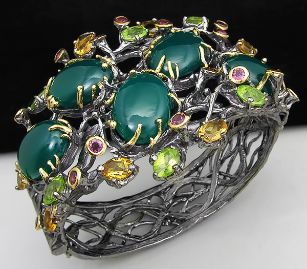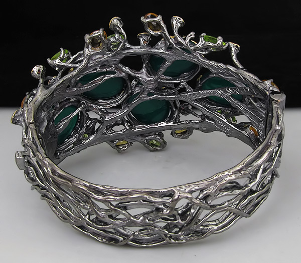 Браслет из черненого стерлингового серебра 925 пробы с зелеными агатами, перидотами, родолитами и цитринами. Вес браслета — 86 гр. Площадка браслета — 73×51 мм. Выборочное золочение.