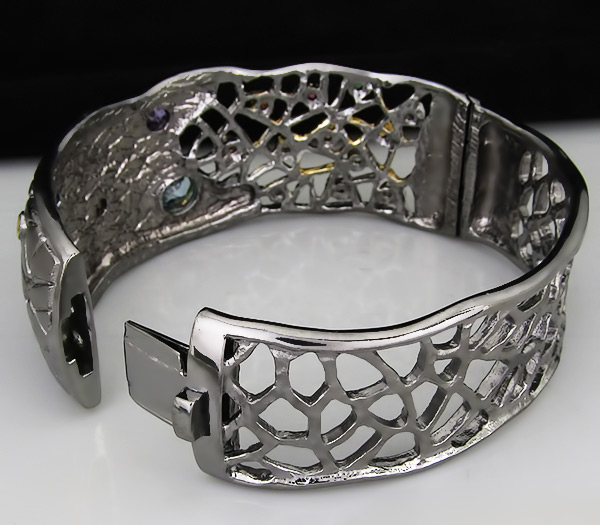 Браслет из черненого стерлингового серебра 925 пробы с аметистами, топазами, дымчатым кварцем, перидотами, разноцветными сапфирами, цаворитами, родолитами и мозамбкскими гранатами. Вес браслета — 60,5 гр. Площадка браслета — 73×28 мм. Выборочное золочение и матирование.