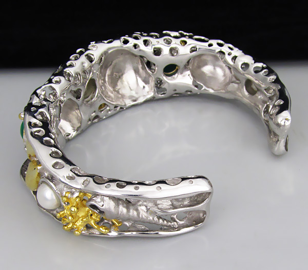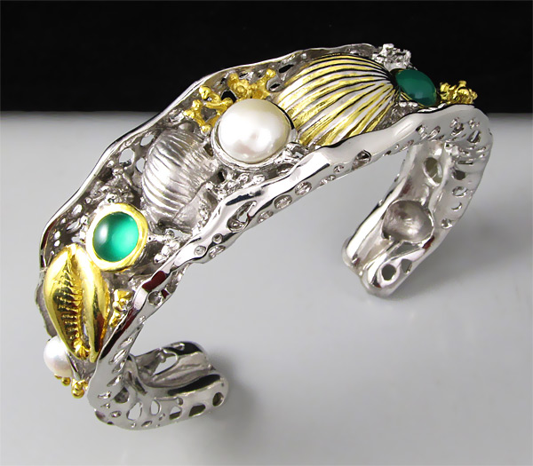 Браслет из стерлингового серебра 925 пробы с жемчужиной и зелеными агатами. Вес браслета — 57,7 гр. Площадка браслета — 79×24 мм. Выборочное золочение.