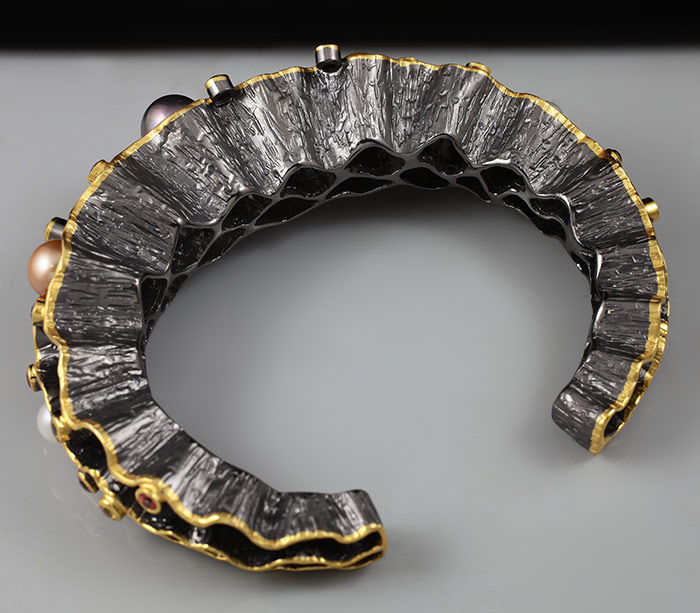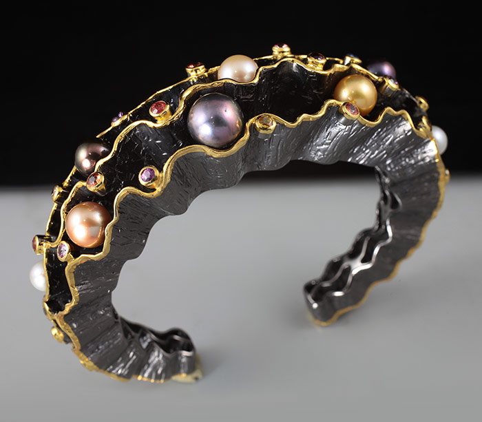 Браслет из черненого стерлингового серебра 925 пробы с разноцветными жемчугом и сапфирами. Вес браслета — 61,8 гр. Площадка браслета — 81×22 мм. Выборочное золочение.
