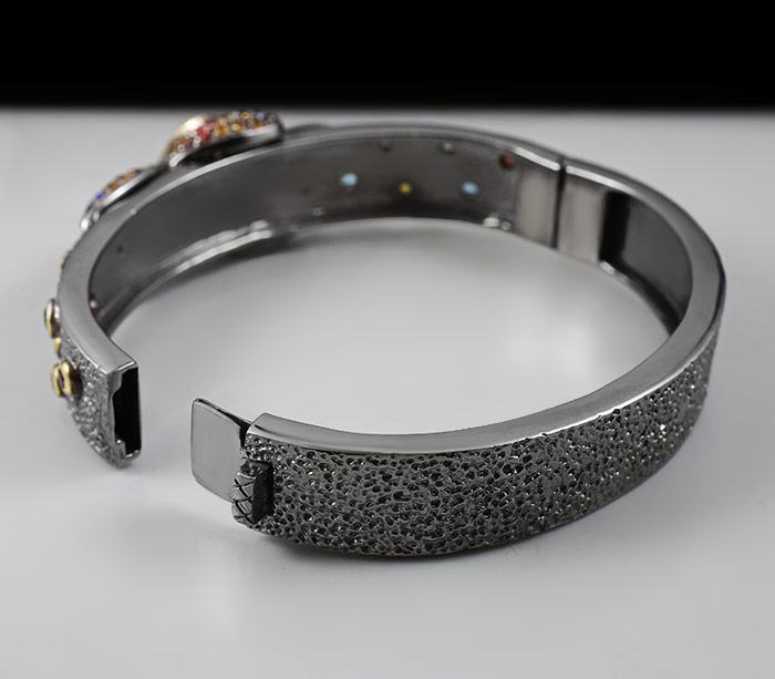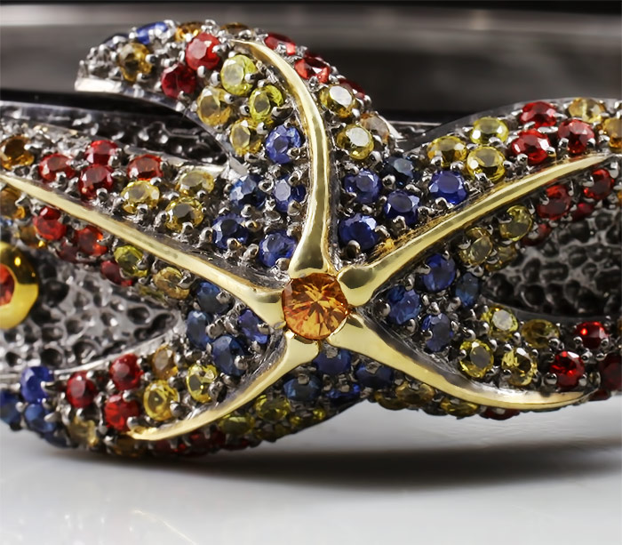 Браслет из черненого стерлингового серебра 925 пробы с цитринами, топазами, аметистами и разноцветными сапфирами. Вес браслета — 40 гр. Площадка браслета — 70×18 мм. Выборочное золочение.