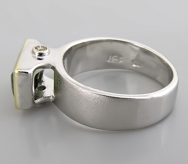 Кольцо из родированного стерлингового серебра 925 пробы с зеленым турмалином и 2 бриллиантами. Выборочное матирование. Оправа бриллиантов и декоративные элементы выполнены из золота 750 пробы. Размеры вставок 2 мм и 10×6 мм. Площадка 12×9 мм, высота 8 мм. Вес изделия 5,9 гр. Размер 17,25.