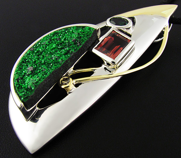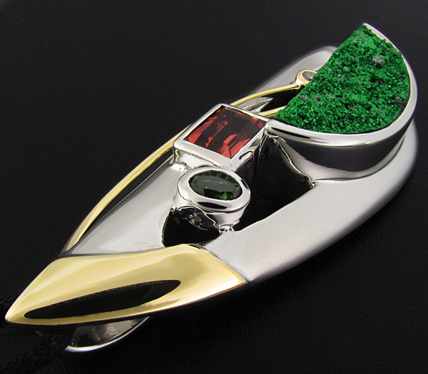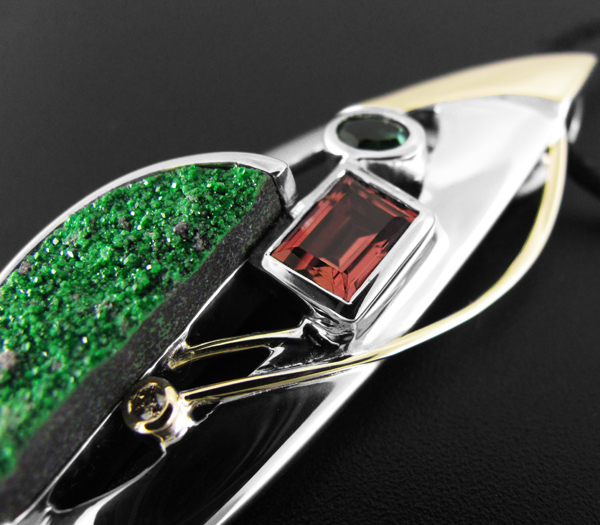 Кулон из стерлингового серебра 925 пробы с друзой агата изумрудного цвета, бриллиантом, зеленым и пурпурным турмалинами. Изделие частично матировано. Оправа бриллианта и декоративные элементы изделия выполнены из золота 585 пробы. Площадка кулона 58 х 23 мм. Вес 24,4 г. Ниже приводятся размеры вставок.