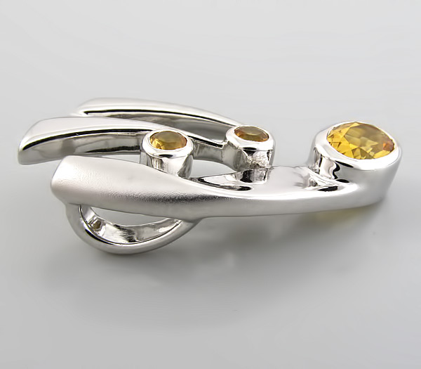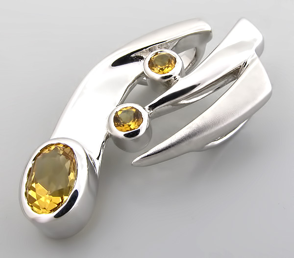 Кулон из родированного стерлингового серебра 925 пробы с золотистыми цитринами. Выборочное матирование. Размеры вставок 3 мм и 7×5 мм. Размеры кулона с петлей 31×15 мм. Вес 6,3 гр.