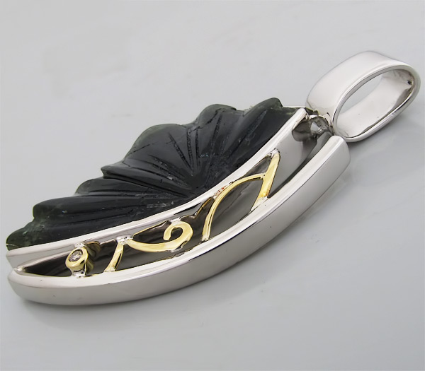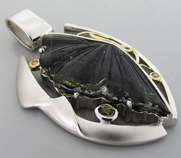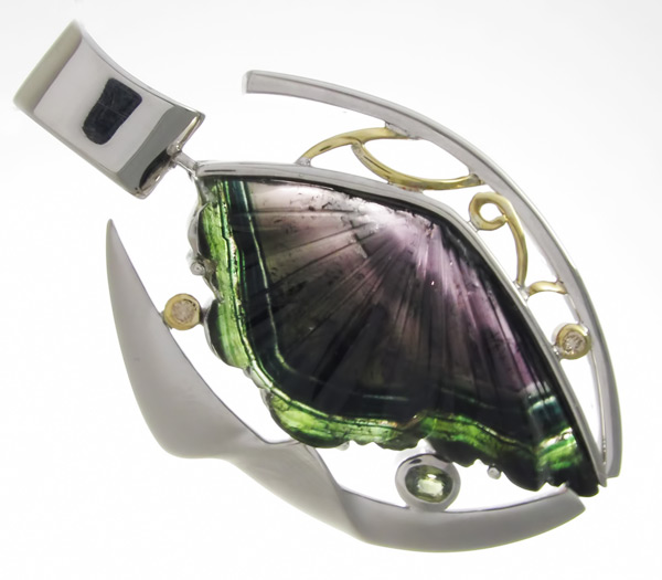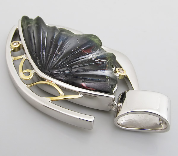 Кулон из родированного стерлингового серебра 925 пробы с резным полихромным турмалином огранки "крыло бабочки", зеленым сапфиром и 2 бриллиантами. Выборочное матирование. Оправа бриллиантов и декоративные элементы выполнены из золота 750 пробы. Размеры вставок от 2 мм до 42×21 мм. Размеры кулона с петлей 59×35 мм. Вес 25,6 гр.