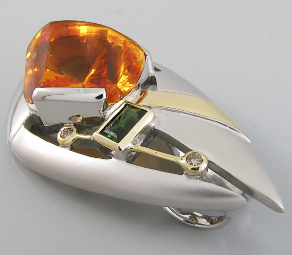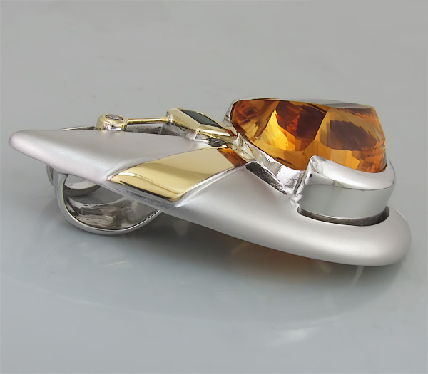 Кулон из родированного стерлингового серебра 925 пробы с крупным цитрином авторской огранки, зеленым турмалином и 2 бриллиантами. Выборочное матирование. Оправа бриллиантов и декоративные элементы выполнены из золота 750 пробы. Размеры вставок от 2 мм до 23×17 мм. Площадка кулона 59×32 мм. Вес 37,4 гр.