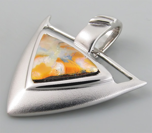 Кулон из родированного стерлингового серебра 925 пробы с болдер опалом. Выборочное матирование. Основные цвета опалесценции опала: розовый/синий. Размер центральной вставки — 15×11 мм. Площадка кулона 31×28 мм. Вес 8,6 гр.