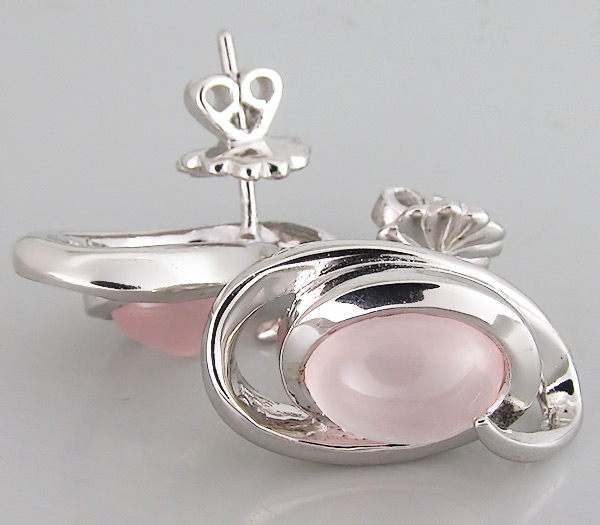 Серьги из родированного стерлингового серебра 925 пробы с розовым кварцем. Размеры вставок 10×7 мм. Площадка серег 21×13 мм. Вес пары 10,4 гр.