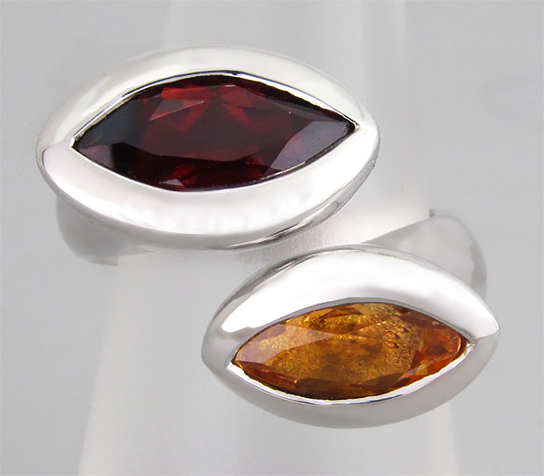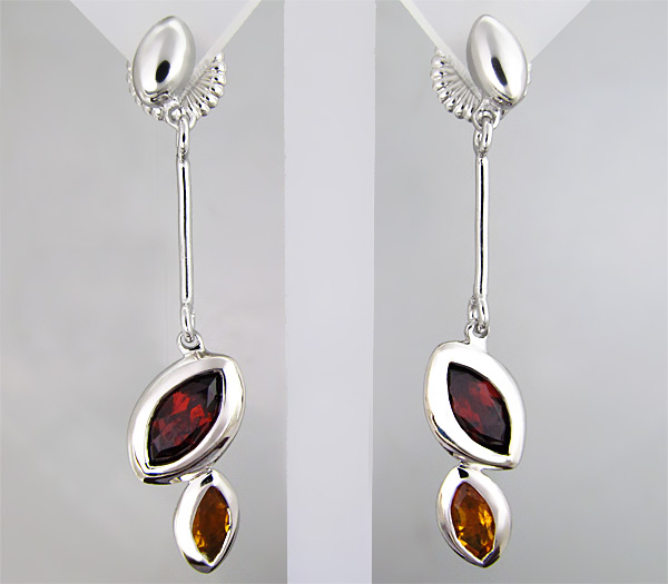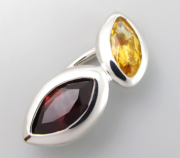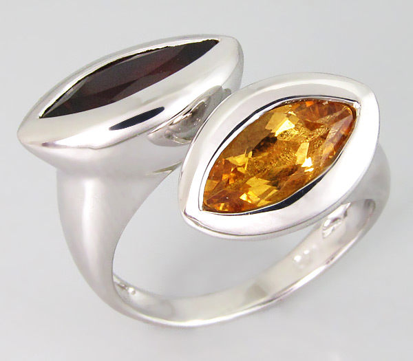Комплект (кольцо + серьги + кулон) из родированного стерлингового серебра 925 пробы с золотистыми цитринами и мозамбикскими гранатами. Размеры вставок от 7×3 мм до 12×5 мм. Вес комплекта 26 гр.