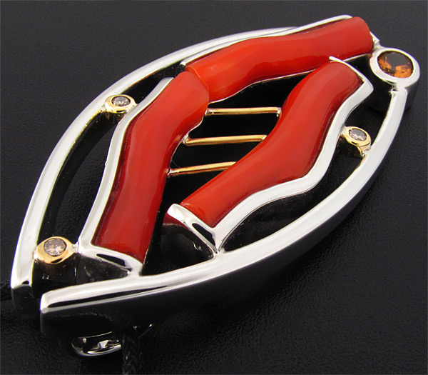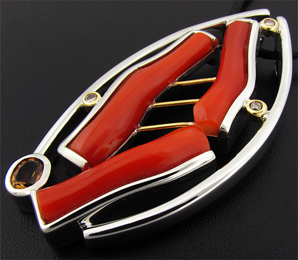 Вашему вниманию предлагается кулон из стерлингового серебра (925 проба) с ярко-красными кораллами, спессартином гранатом и 3 бриллиантами! Оправа бриллиантов и декоративные элементы изделия выполнены из золота 585 пробы. Площадка кулона 54 х 28 мм. Вес 25,9 г. Ниже приводятся размеры вставок.